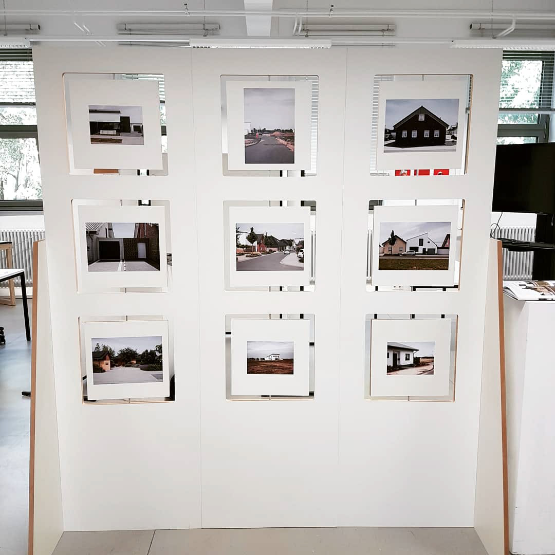 Im Fotobuch fällt auf, dass die Individualität der Häuser und der immer gleichbleibende Aufbau der Straßen und Parks dafür sorgt, dass sich die Ortschaften kaum unterscheiden. Neben dem Buch sollte aber auch die Präsentation auf der Semesterausstellung in das Konzept passen. Aus diesem Grund wurden die Bilder auf drehbaren Elementen einer Stellwand aufgebracht. So können die Besucher:innen auf der Ausstellung selber interaktiv erfahren, was passiert, wenn man die Elemente dreht und Fotografien austauscht.